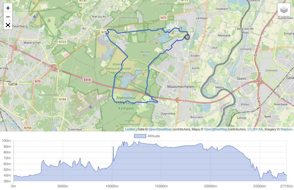Arrivé à hauteur de la route « Steenweg naar As », les deux parcours se séparent. La boucle de 18 km poursuit sa route en direction du centre de Maasmechelen pour revenir vers le point de départ. L’itinéraire de 27 km, lui, bifurque vers la réserve naturelle de Mechelse Heide.