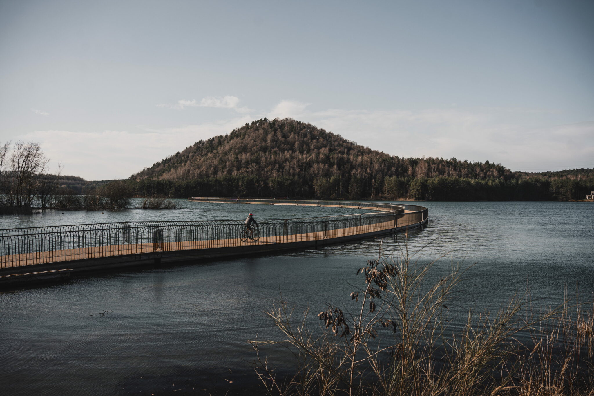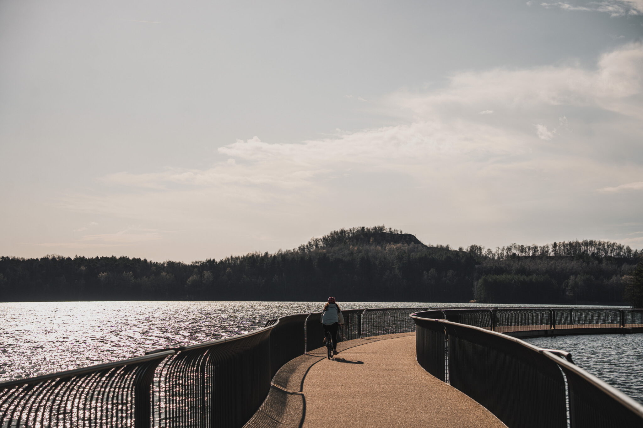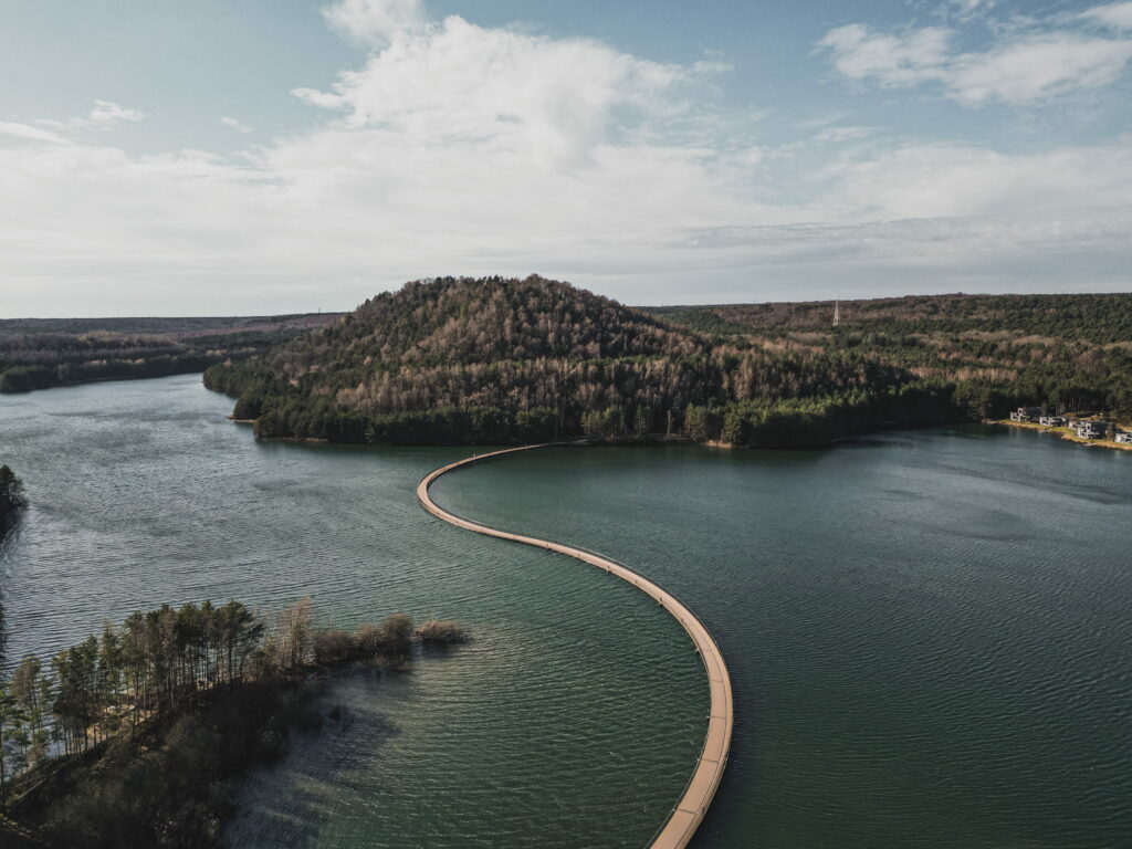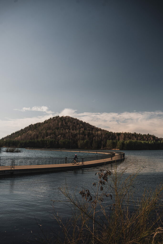 L’élément emblématique du parcours est la passerelle vélo flottante reliant les deux terrils au-dessus du lac.